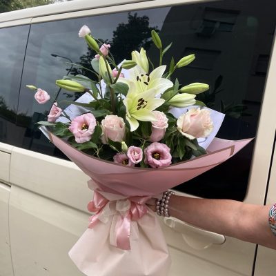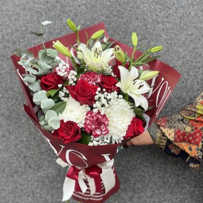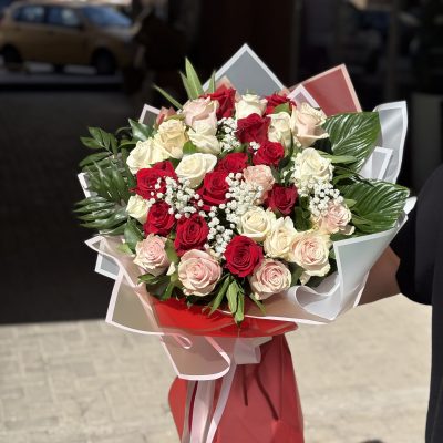 Beautifully decorated box filled with 15 roses, champagne and sweets