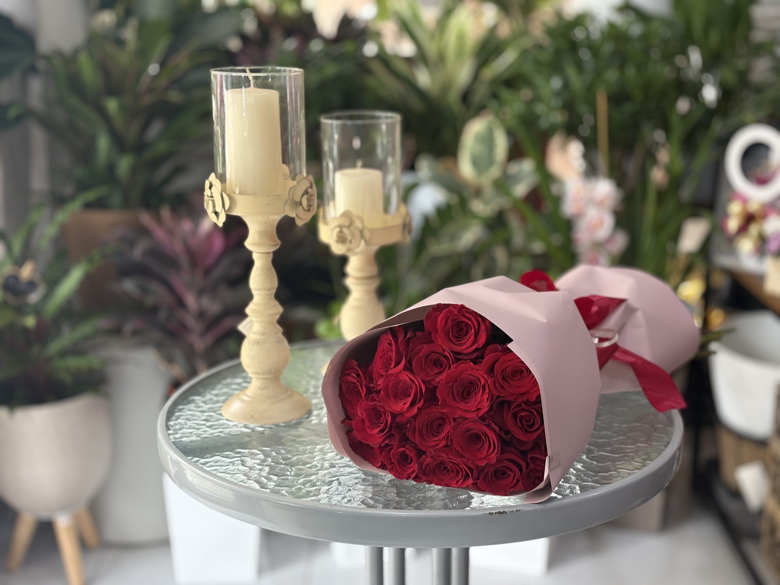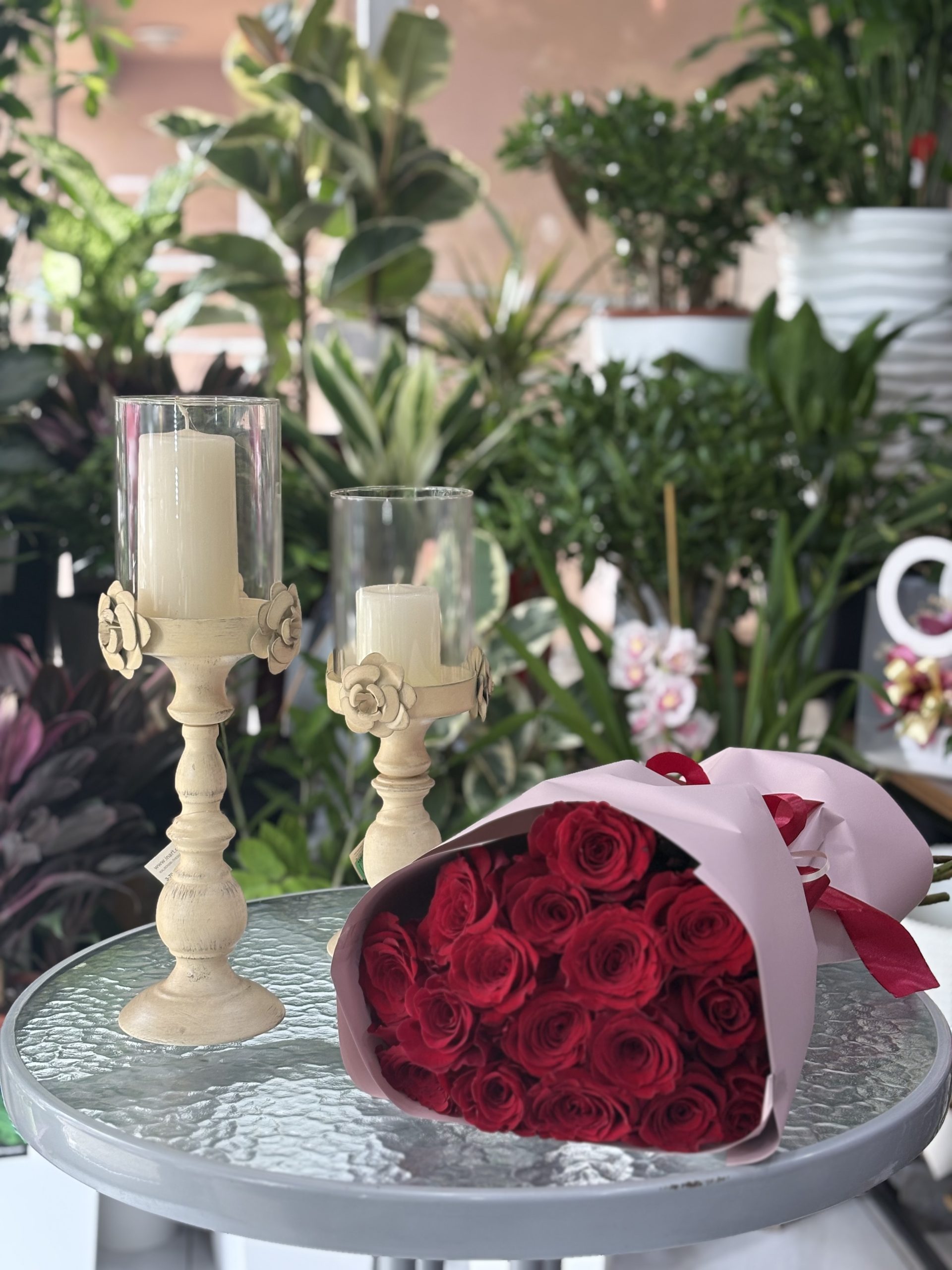 11 Roses with Two Large Candle Holders