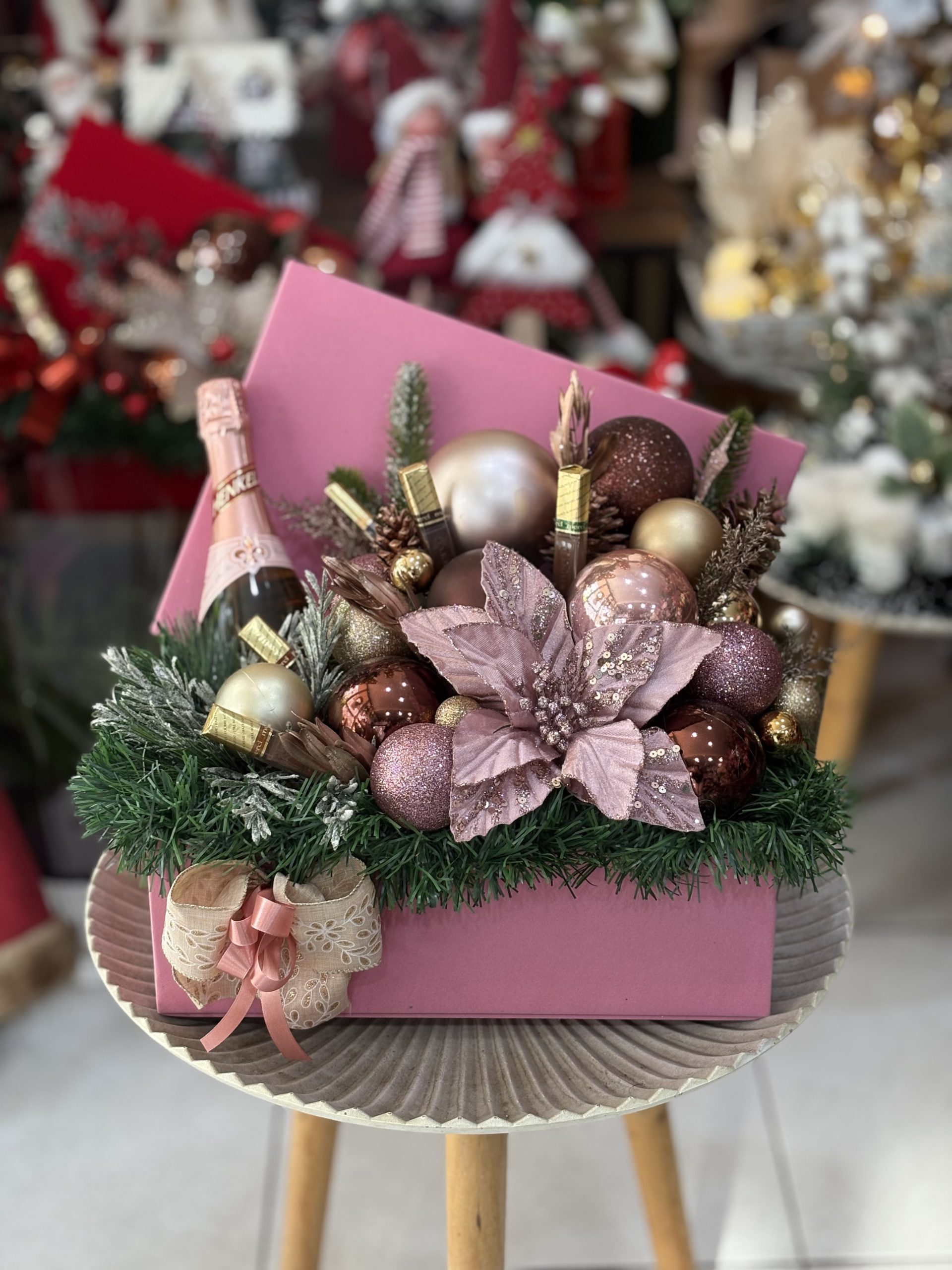 • New Year’s box with wine and chocolate. exquisite gift box combines fine wine, delicious candies, and sparkling New Year’s ornaments, creating a magical atmosphere for your occasion. Completed with a large, decorated flower, it is the perfect choice for an unforgettable gift that brings joy and elegance.