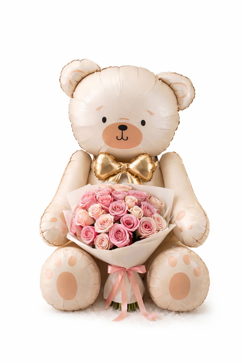 A large teddy bear balloon(75x100cm)  with a beautiful bouquet of 25 roses on the side.