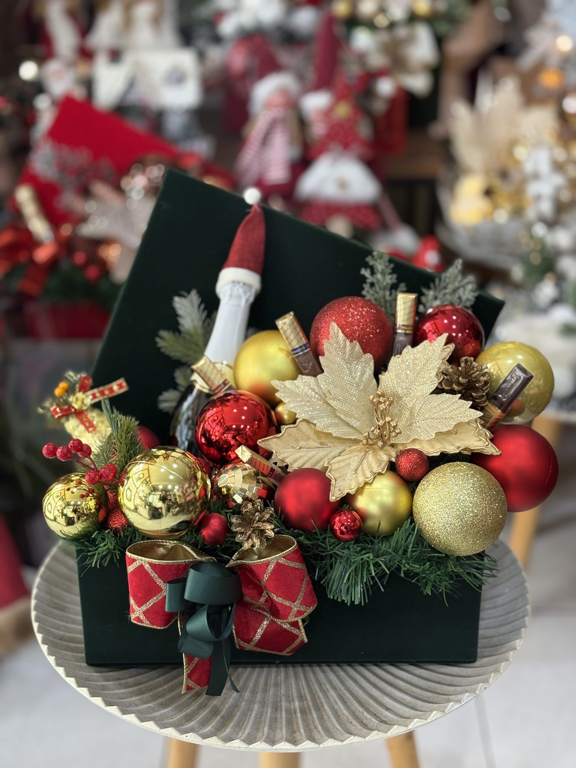 New Year’s box with wine and chocolate. exquisite gift box combines fine wine, delicious candies, and sparkling New Year’s ornaments, creating a magical atmosphere for your occasion. Completed with a large, decorated flower, it is the perfect choice for an unforgettable gift that brings joy and elegance.